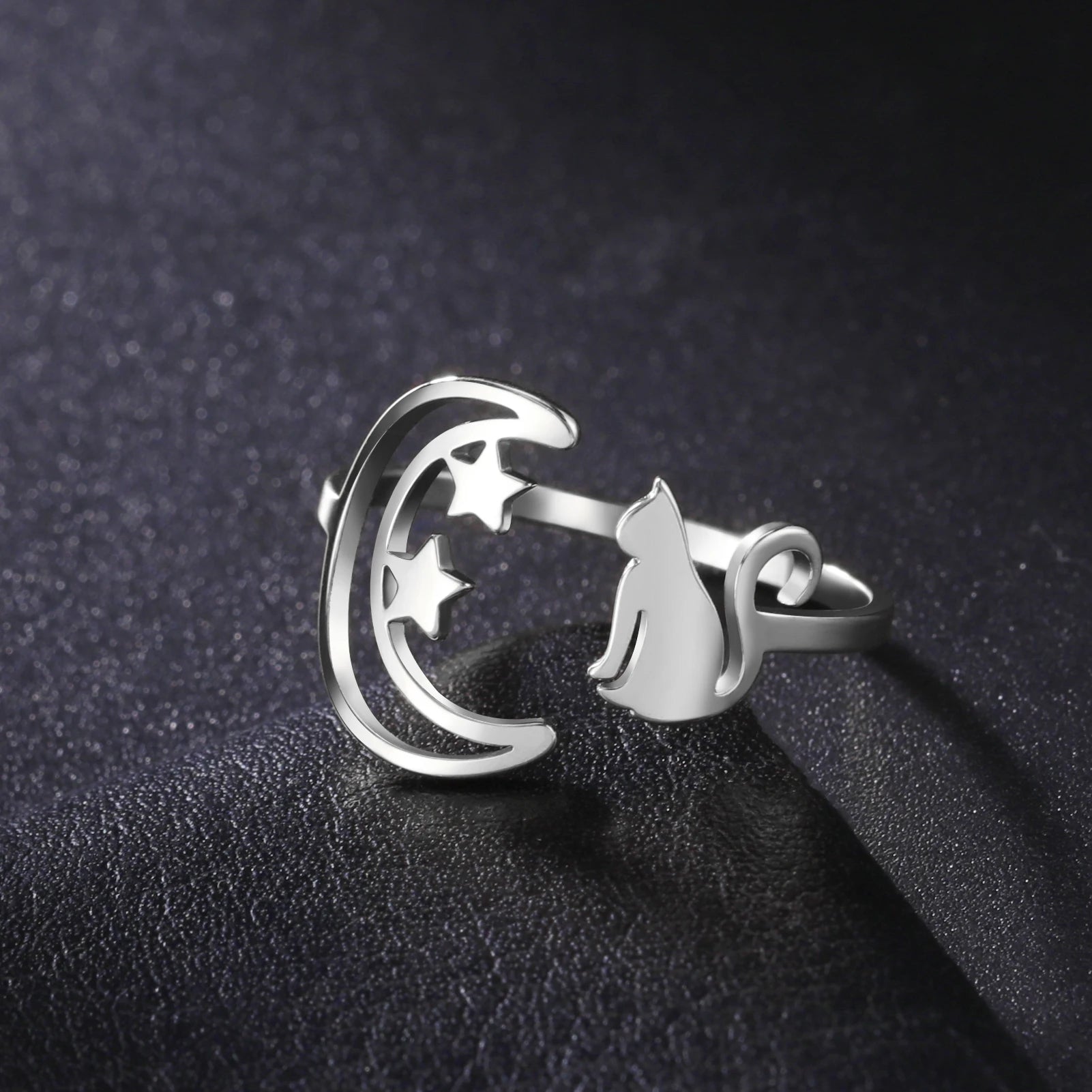 Crafted with a minimalist's dream in mind, this charming ring features a delicate cat silhouette thoughtfully positioned against a crescent moon dotted with stars. Its clever open design means it's adjustable, ensuring a comfortable and perfect fit on any finger. Whether you choose the warm glow of real gold plating or the cool, modern shine of steel, this ring is designed to be a conversation starter and a reflection of your unique style.